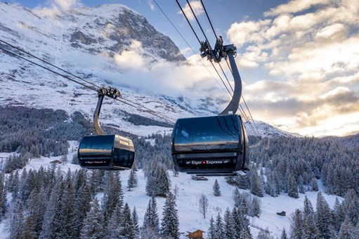 安排乘坐 2020 年底全新推出的纜車「艾格快線」(Eiger Express),全⾧近6.5公里,有44個可容納26人的大型車廂。由格林德瓦前往艾格峰冰川站只需15分鐘。