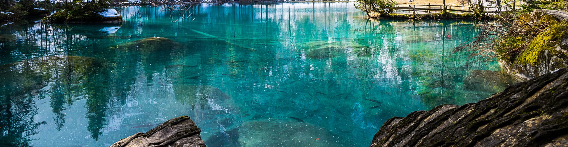 Kandergrund 自然公園內的絕美秘境—藍湖(Blausee),位處海拔兩千多米。清澈見底的湖水,造就當地成為著名三文魚