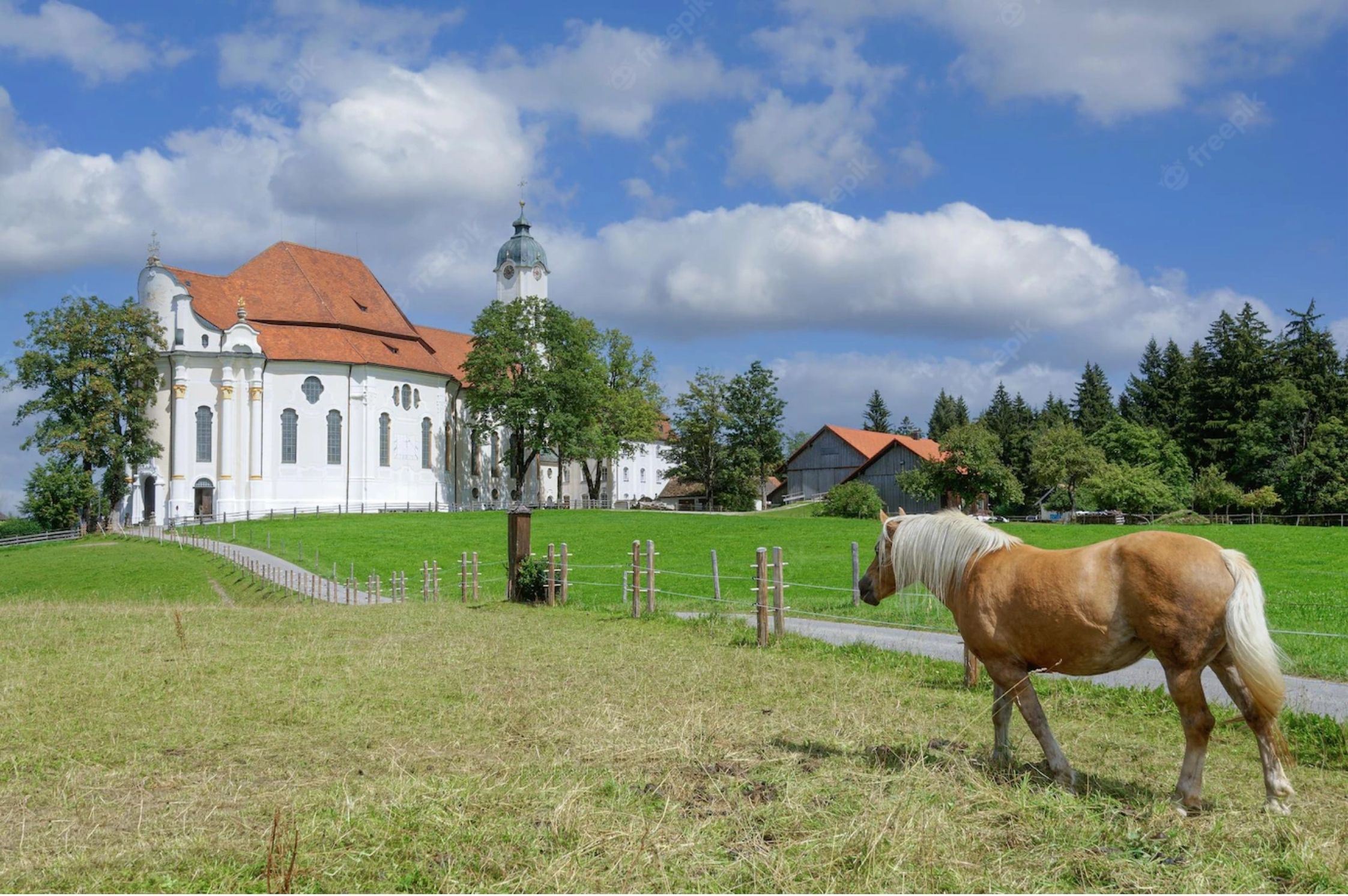 座落於風景秀麗的阿爾卑斯山山麓,落成於1754 年,至今保存完好,1983年列為世界文化遺產。教堂外表樸實,內部裝潢華麗,是巴伐利亞地區的洛可可建築代表作。