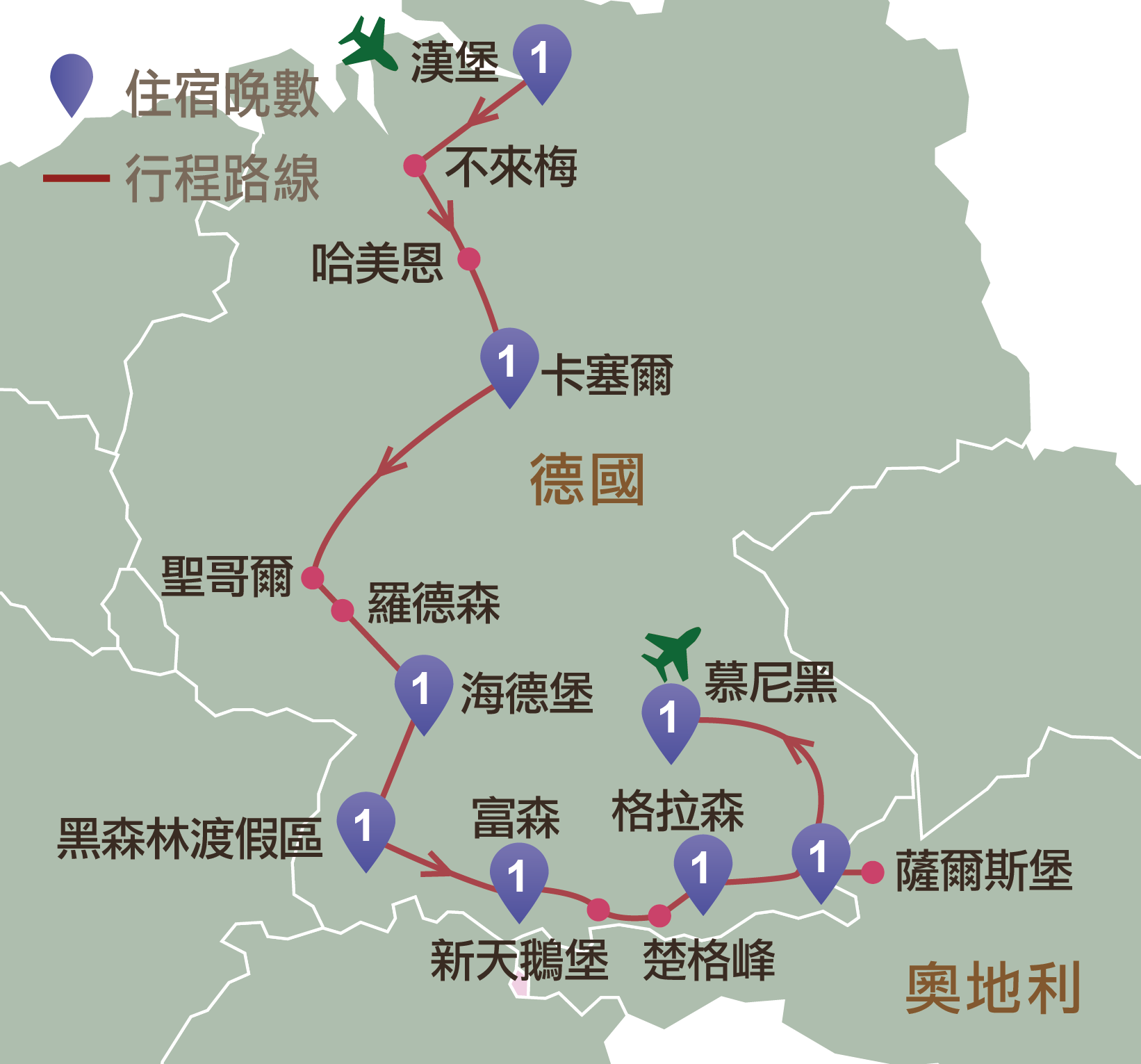 德國:漢堡、呂貝克、不來梅、哈美恩、卡塞爾、聖哥爾、羅德森、海德堡、迪的斯湖、黑森林渡假區、新天鵝堡、富森、楚格峰、格拉森/羅森海姆、海倫基姆湖、國王湖、慕尼黑