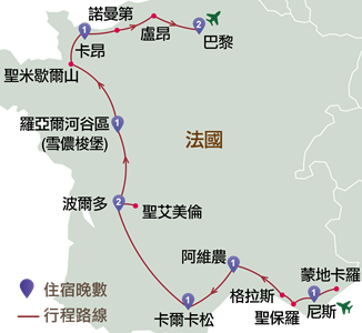 法國:尼斯、聖保羅、格拉斯、阿維農、卡爾卡松、波爾多、聖艾美倫、羅亞爾河谷區、聖米歇爾山、卡昂、巴約、諾曼第、盧昂、巴黎