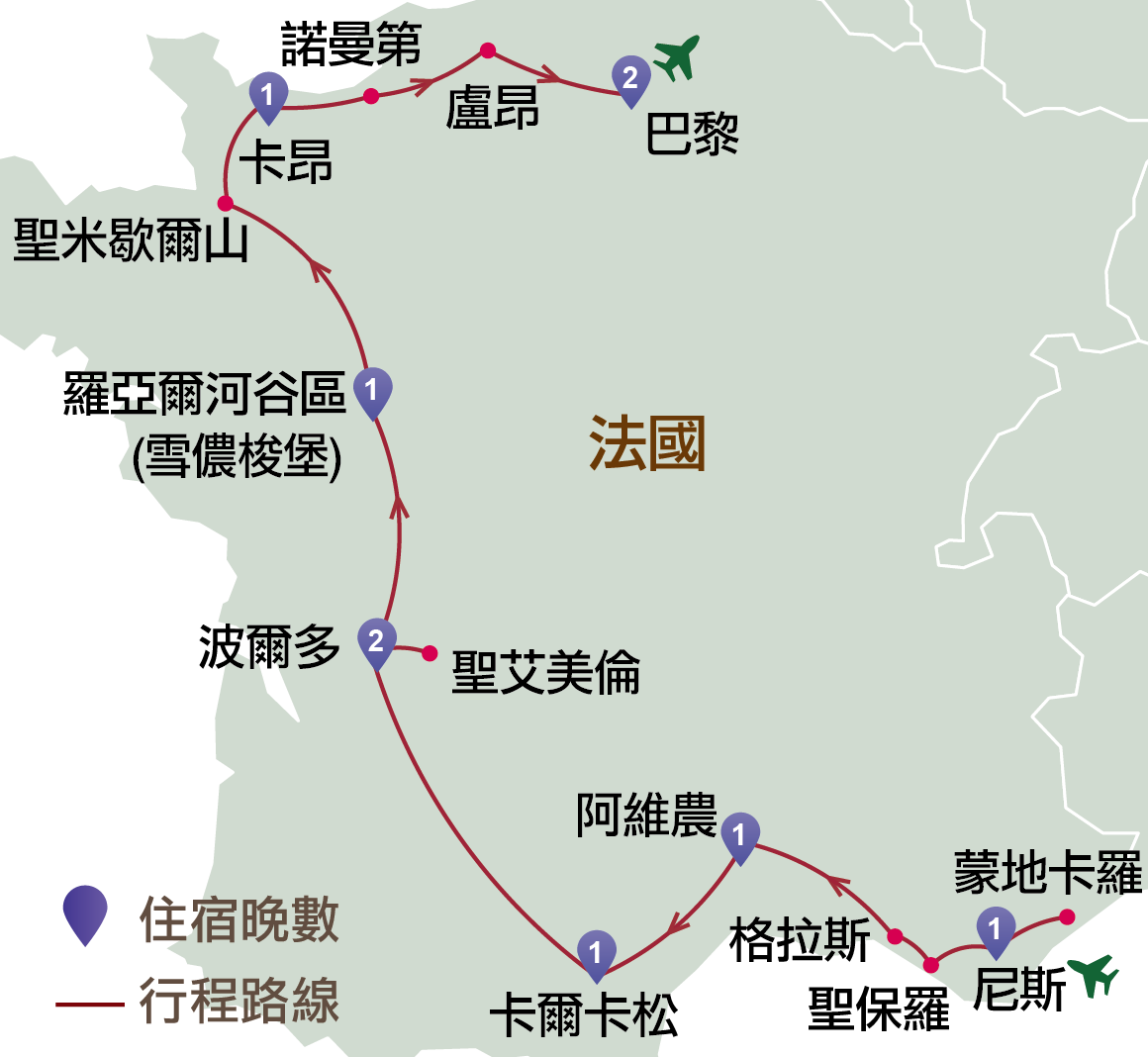 法國:尼斯、聖保羅、格拉斯、阿維農、卡爾卡松、波爾多、聖艾美倫、羅亞爾河谷區、聖米歇爾山、卡昂、巴約、諾曼第、盧昂、巴黎