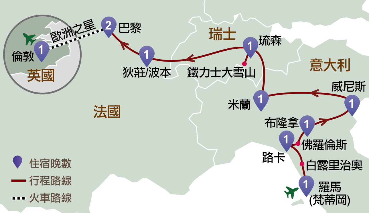 是歐洲旅遊非常受歡迎的路綫,包羅藝術、文化及歷史;亦是尊賞假期的皇牌行程。品味文藝復興時代的絕世風華,宏偉的建築及巧奪天工的工藝雕塑,永恆之城~羅馬,文藝興發源地~佛羅倫斯,迷人水鄉~威尼斯,綻放令人陶醉的古典情懷,使人目不暇給。享負盛名的鐵力士大雪山,擁有世界首創的360°旋轉登山纜車及攝人美景;時尚大都會~巴黎及倫敦,讓人目不暇給。