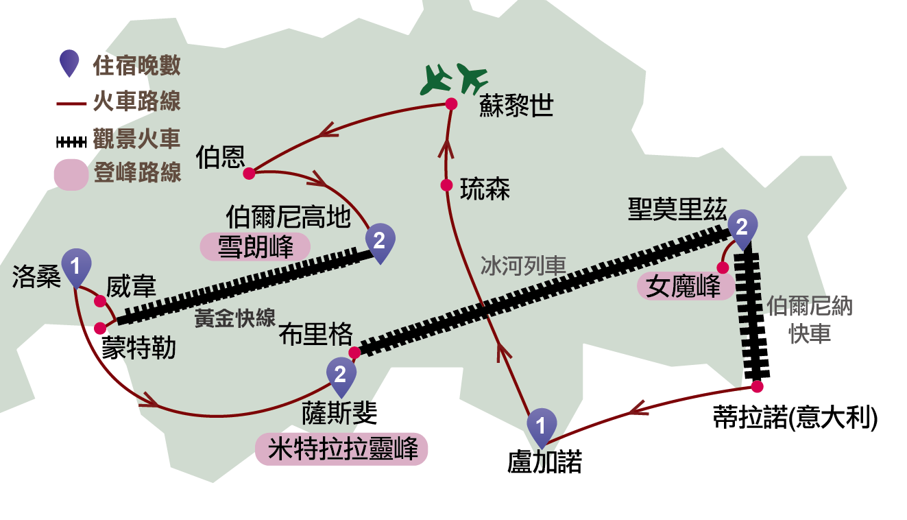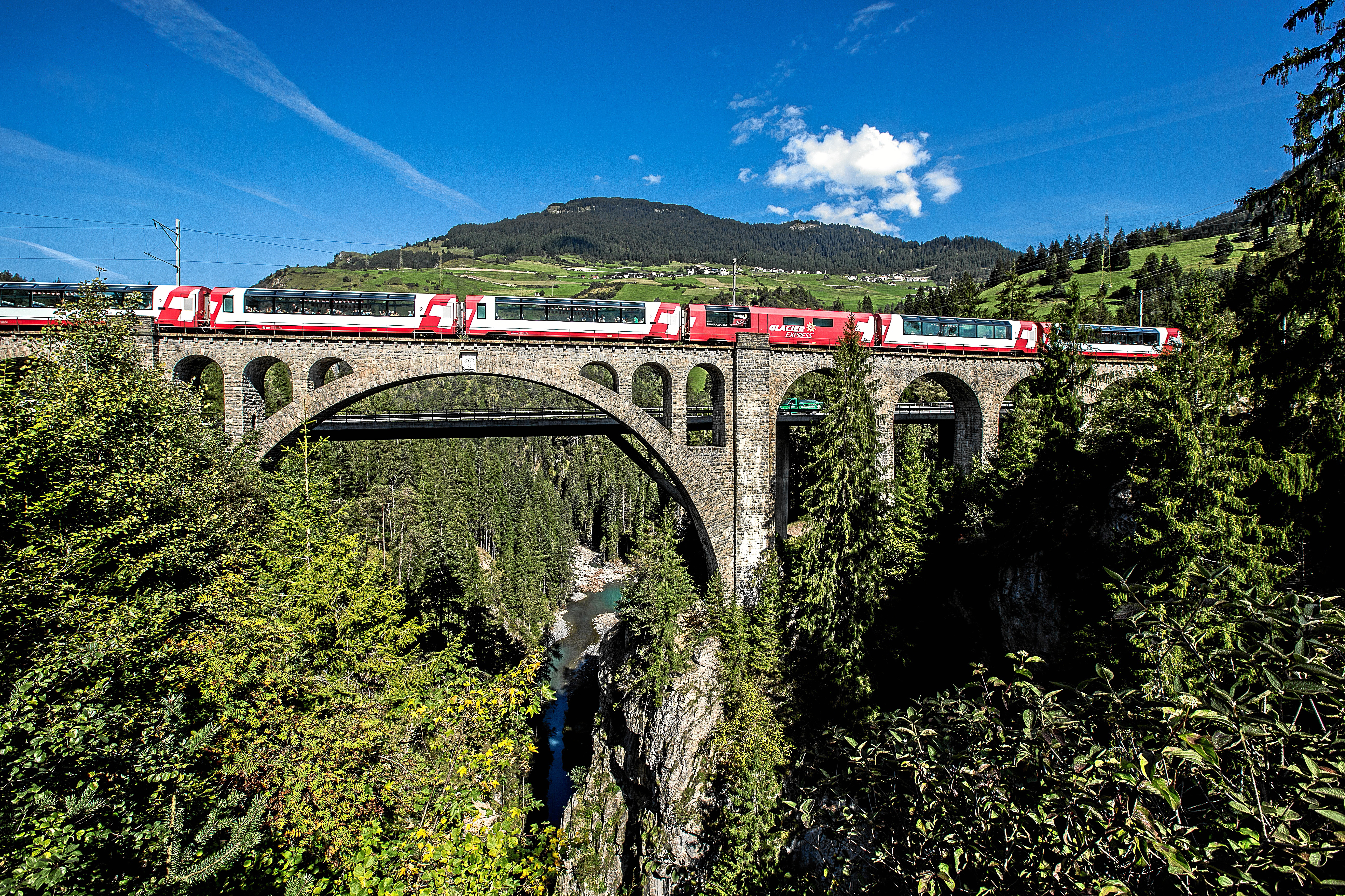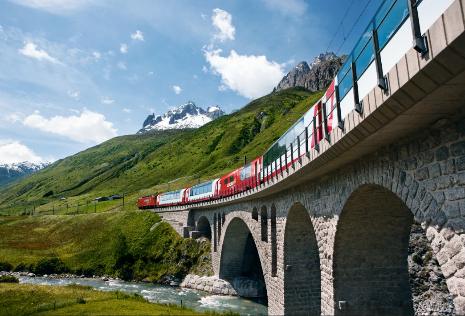 名列世界文化遺產的觀光鐵路,沿途高度落差高達海拔 1,800 公尺,雪嶺雄峰,冰川美景,蔚為奇觀。在普斯提亞沃谷地的360 度轉彎拱橋,鬼斧神工的建築技術與景觀, 更是令人讚嘆不已。