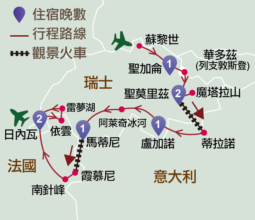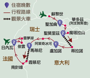 註︰如伯爾尼納快車未能提供團體訂位,將改乘相同路線國鐵列車,車內不安排指定座位,部分座位設有可供開啟車窗,沿路拍照更方便。每位團友退回港幣$350元。