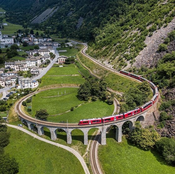 名列世界文化遺產的觀光鐵路,沿途高度落差高達海拔 1,800 公尺,雪嶺雄峰,冰川美景,蔚為奇觀。在普斯提亞沃谷地的 360 度轉彎拱橋,鬼斧神工的建築技術與景觀, 更是令人讚嘆不已。