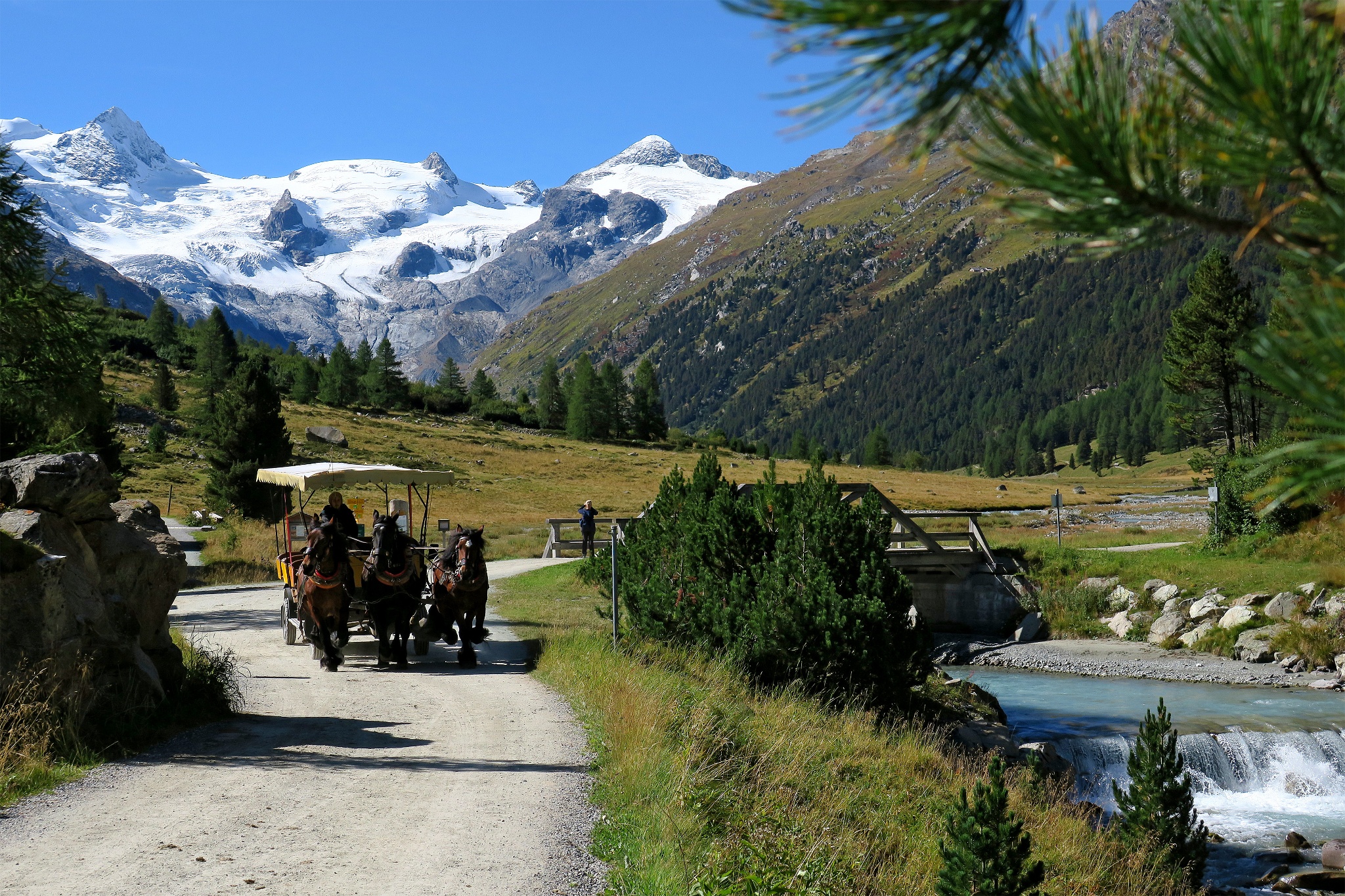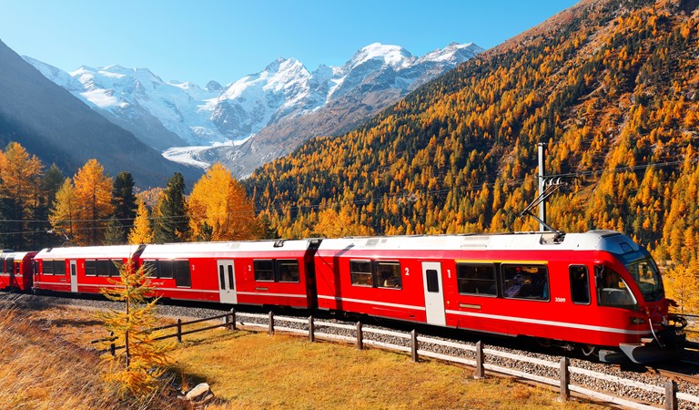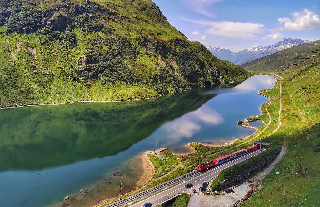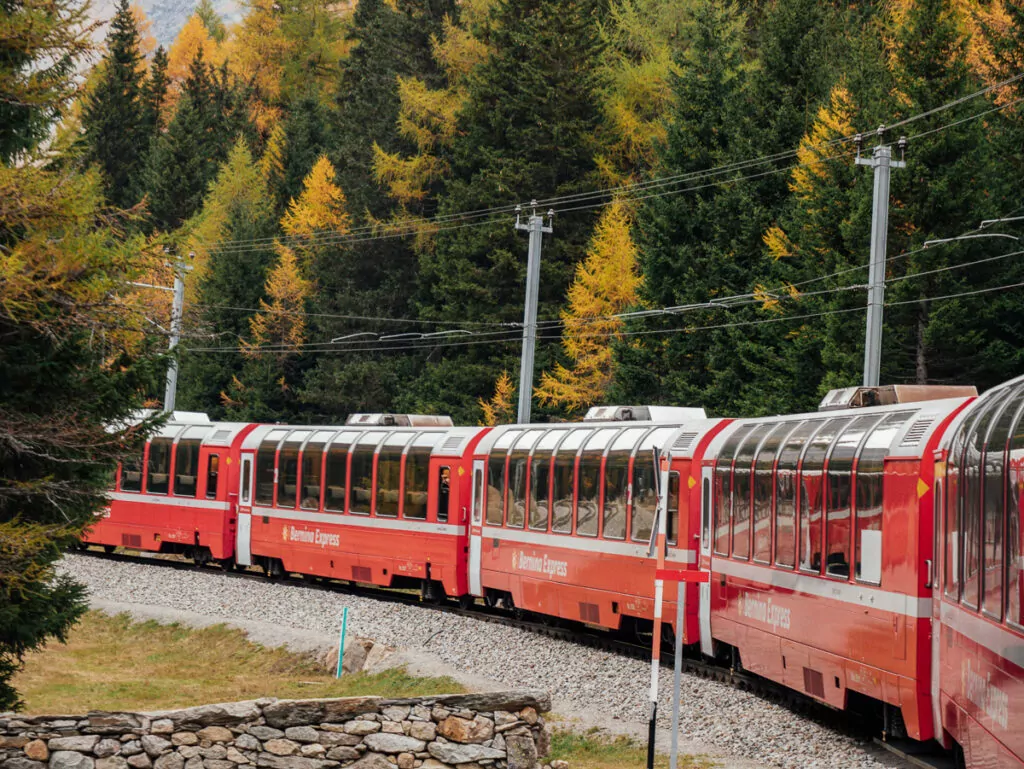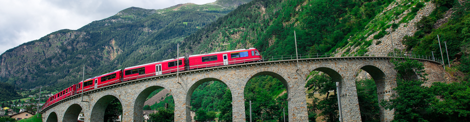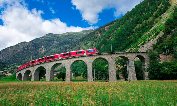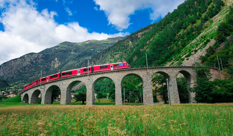 名列世界文化遺產的觀光鐵路,沿途高度落差高達海拔 1,800 公尺,雪嶺雄峰,冰川美景,蔚為奇觀。在普斯提亞沃谷地的 360 度轉彎拱橋,鬼斧神工的建築技術與景觀,更是令人讚嘆不已。
