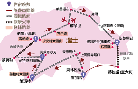 **鐵道團全程以瑞士鐵路系統之交通工具,包括火車、纜車、吊車、公共巴士及郵政巴士等作為主要交通工具
