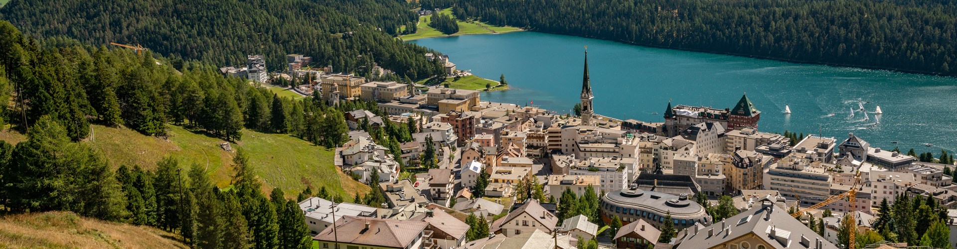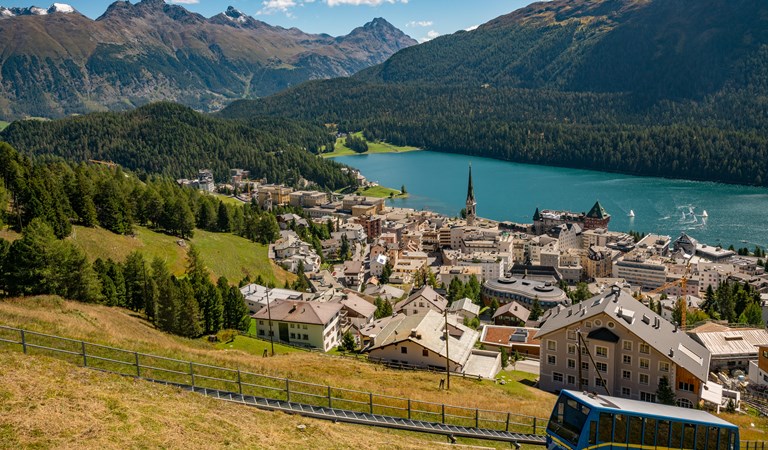 聖莫里茲座落於聖莫里茲湖北岸,湖畔美景和雪白群山;大街上有很多時裝店和高檔零售店。