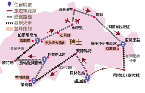 **鐵道團全程以瑞士鐵路系統之交通工具,包括火車、纜車、吊車、公共巴士及郵政巴士等作為主要交通工具
