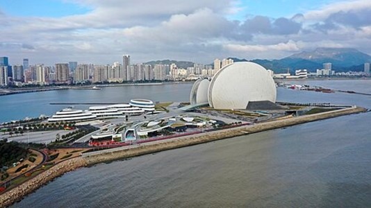 位珠海市情侶路野狸島上,一座臨海的「珠海大劇院」,這是中國唯一建設於海島上的歌劇院,也成為了當地著名的地標。其外型獨特,由兩組一大一小的「貝殼」組成,又被稱為「日月貝」。