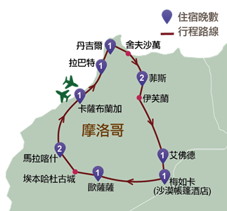 卡薩布蘭加、拉巴特、艾⻄拉、丹吉爾、舍夫沙萬、菲斯、艾佛德、梅如卡、撒哈拉沙漠、廷吉爾、歐薩薩、埃本哈杜古城、馬拉喀什