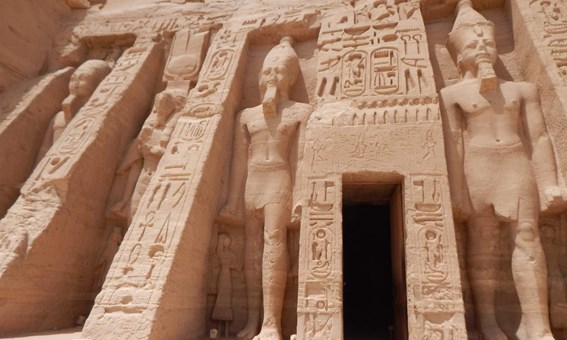 『埃及最有價值的建築遺跡』~阿布辛貝神廟位於埃及南部,神廟深處別有洞天。殿中的高大廊柱上刻著戰爭場景的藝術浮雕,柱頂的天花板下畫著張開翅膀的禿鷲。殿內上下各處的象形文字描述著古埃及第十九朝法老拉美西斯二世時代的顯赫戰功。