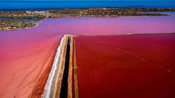 從上方俯瞰,湖水猶如粉紅泡泡糖。與四周環繞的白沙灘及蔚藍海洋相映成趣。