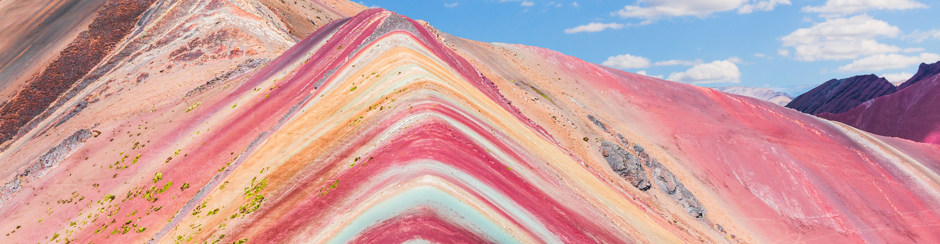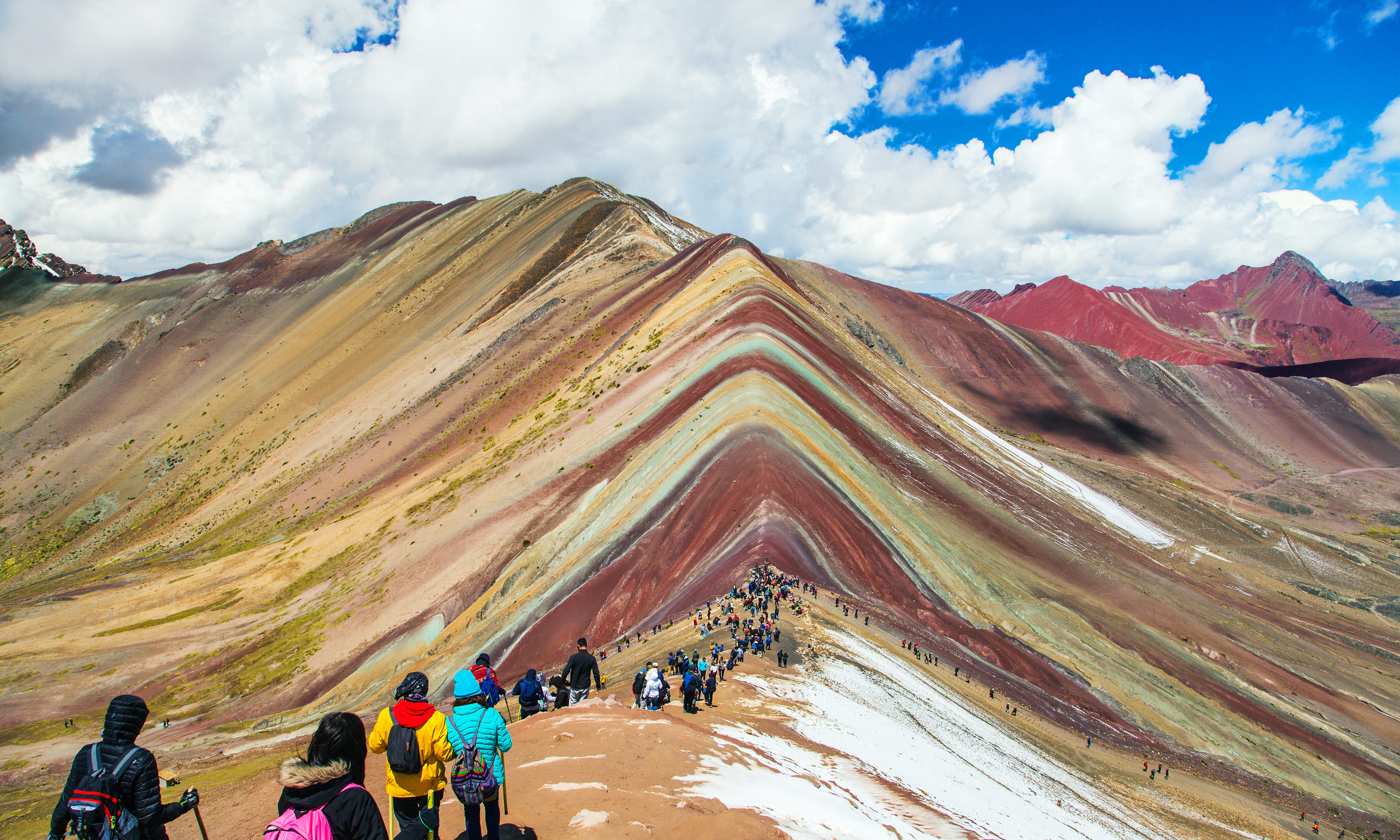 位於安地斯山脈的七彩山麓,因顏色繽紛而有「彩虹山」稱號,這座層次分明的美麗山脈位於海拔高達5000公尺以上,是屬於少見的「丹霞地貌」,所謂「丹霞地貌」是指一種沉積在內陸盆地的紅色岩層,這種岩層經過千百萬年以上的地質變化過程、被水切割侵蝕,最後才形成了我們眼睛所見的「紅色山麓」。