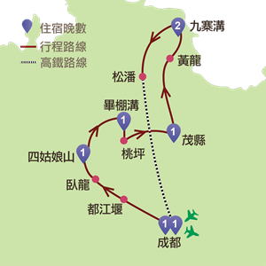 、臥龍、四姑娘山、畢棚溝、茂縣、黃龍、九寨溝、松潘、成都