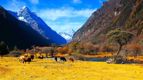 洛絨牛場: 被三座神山環繞的高山牧場(海拔約4180米),周圍是連綿的高山草甸,春夏時分草甸上野花盛開,漫山遍野;秋季層林盡染,景色絕美,非常壯觀。