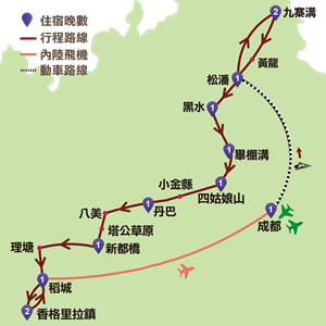 成都、九寨溝、黃龍、黑水(羊茸哈德、奶子溝、達古冰川)、畢棚溝、四姑娘山、丹巴(甲居藏寨)、八美(墨石地質公園)、塔公草原、新都橋、理塘、稻城(亞丁)