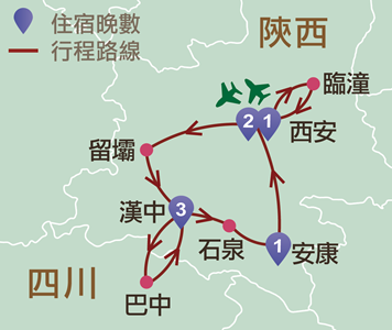 陝西(西安、臨潼、留壩、漢中、石泉、安康)、四川(巴中光霧山)