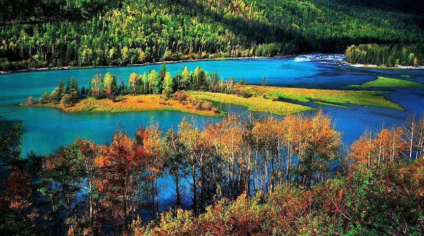 神仙灣: 喀納斯河在喀納斯湖景區內最寬的河段,常有雲霧繚繞,山景湖水、樹木相映,如臨仙境,神仙灣由此得名。