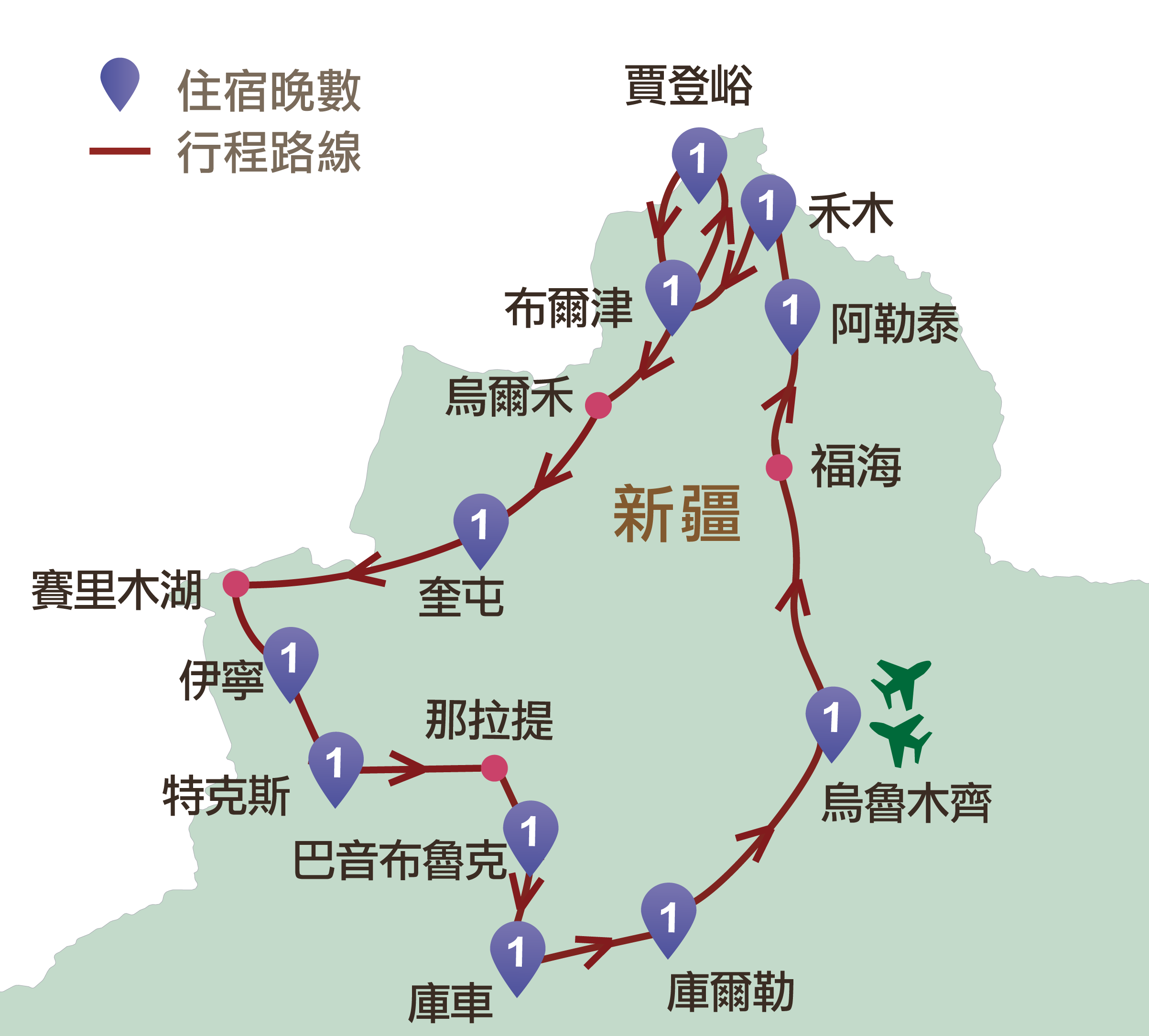烏魯木齊、福海、阿勒泰、禾木、喀納斯、賈登峪、布爾津、烏爾禾、克拉瑪依、賽里木湖、果子溝、伊寧、天山花海、那拉提、獨庫公路、巴音布魯克、天山大峽谷、庫車、庫爾勒、博斯騰湖、天山勝利隧道