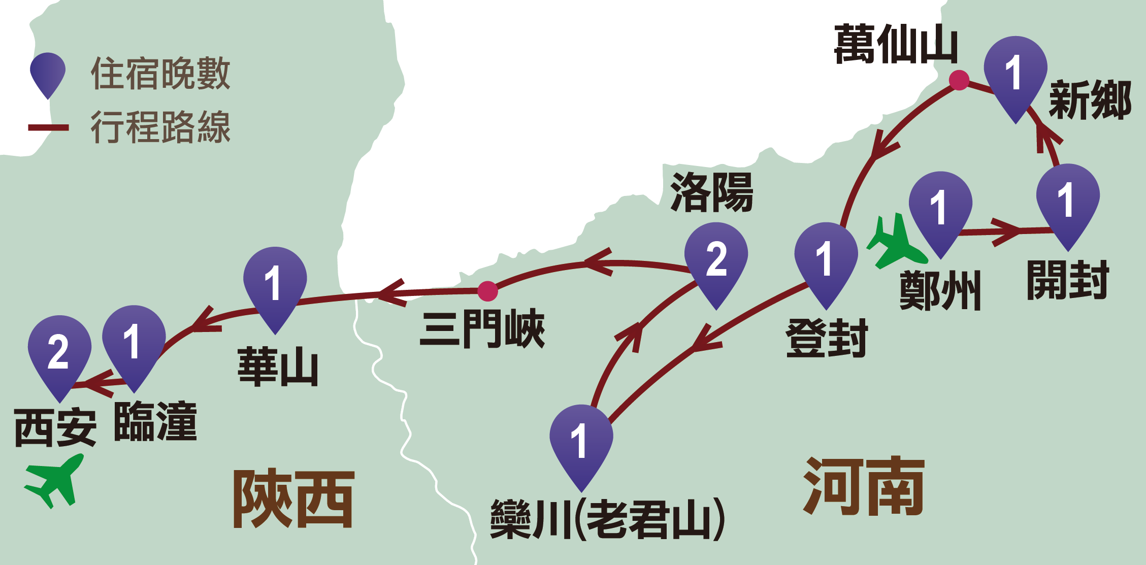 河南(鄭州、開封、新鄉、登封、欒川、洛陽、三門峽)、陝西(華山、臨潼、西安)