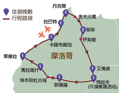 卡薩布蘭加、拉巴特、丹吉爾、艾⻄拉、舍夫沙萬、菲斯、艾佛德、撒哈拉沙漠、梅如卡、廷吉爾、歐薩薩、埃本哈杜古城、馬拉喀什、索維拉
