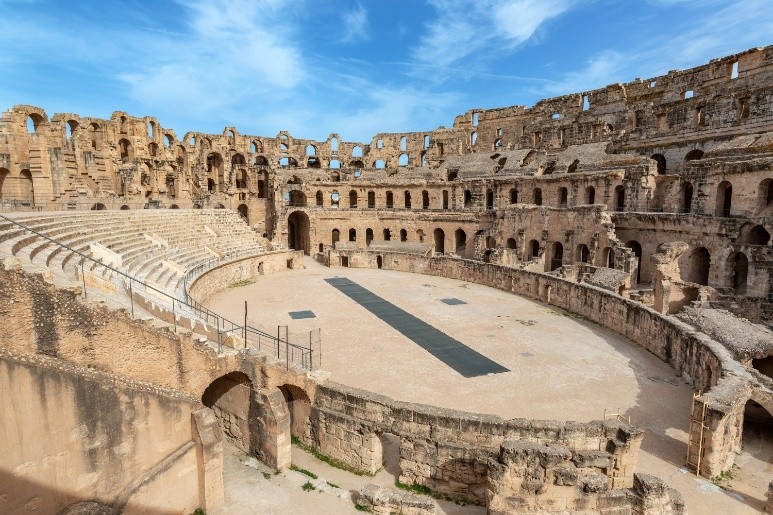 建於公元3 世紀初,是古羅馬帝國在非洲留下的輝煌建築,它是羅馬所興建的25座競技場中最大的一座,規模僅次於古羅馬鬥獸場。高大的拱廊圍牆,精美絕倫的石雕、宏偉的廊柱,是羅馬帝國在非洲存在的象徵。著名電影《帝國驕雄》亦於此地取景。