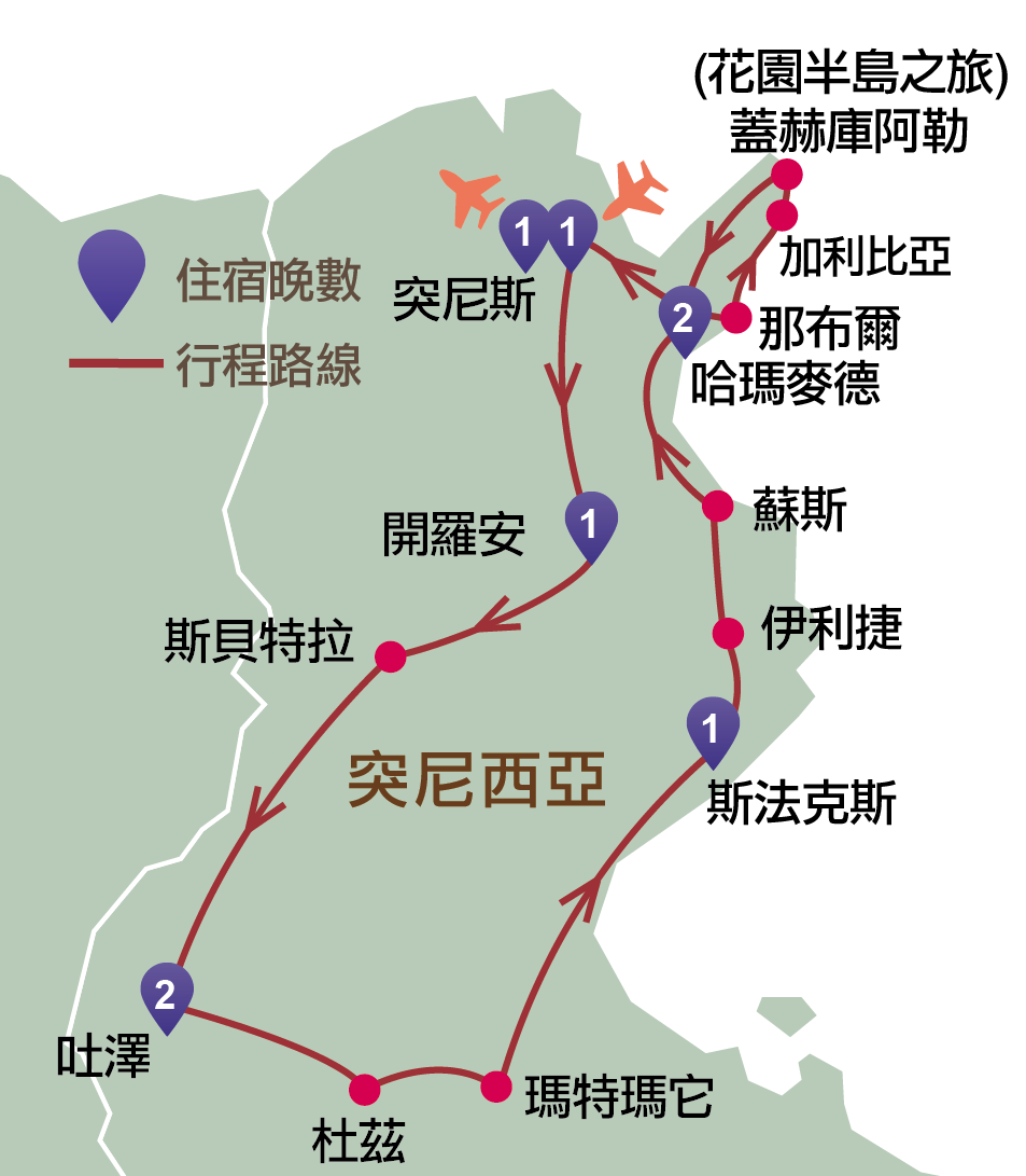 突尼斯、西迪布賽伊德、開羅安、斯貝特拉、吐澤、杜茲、瑪特瑪它、斯法克斯、蘇斯、哈瑪麥德、那布爾、花園半島