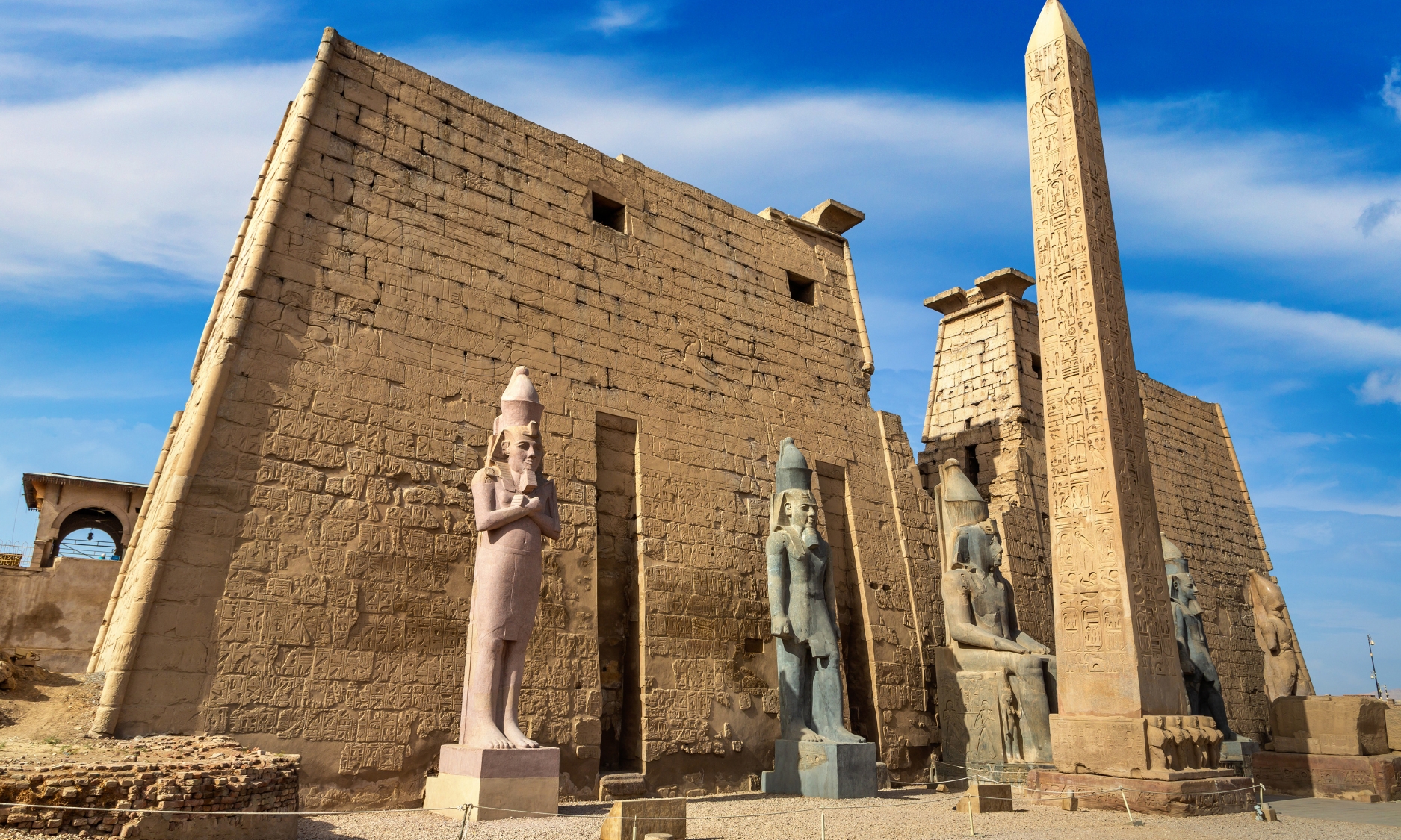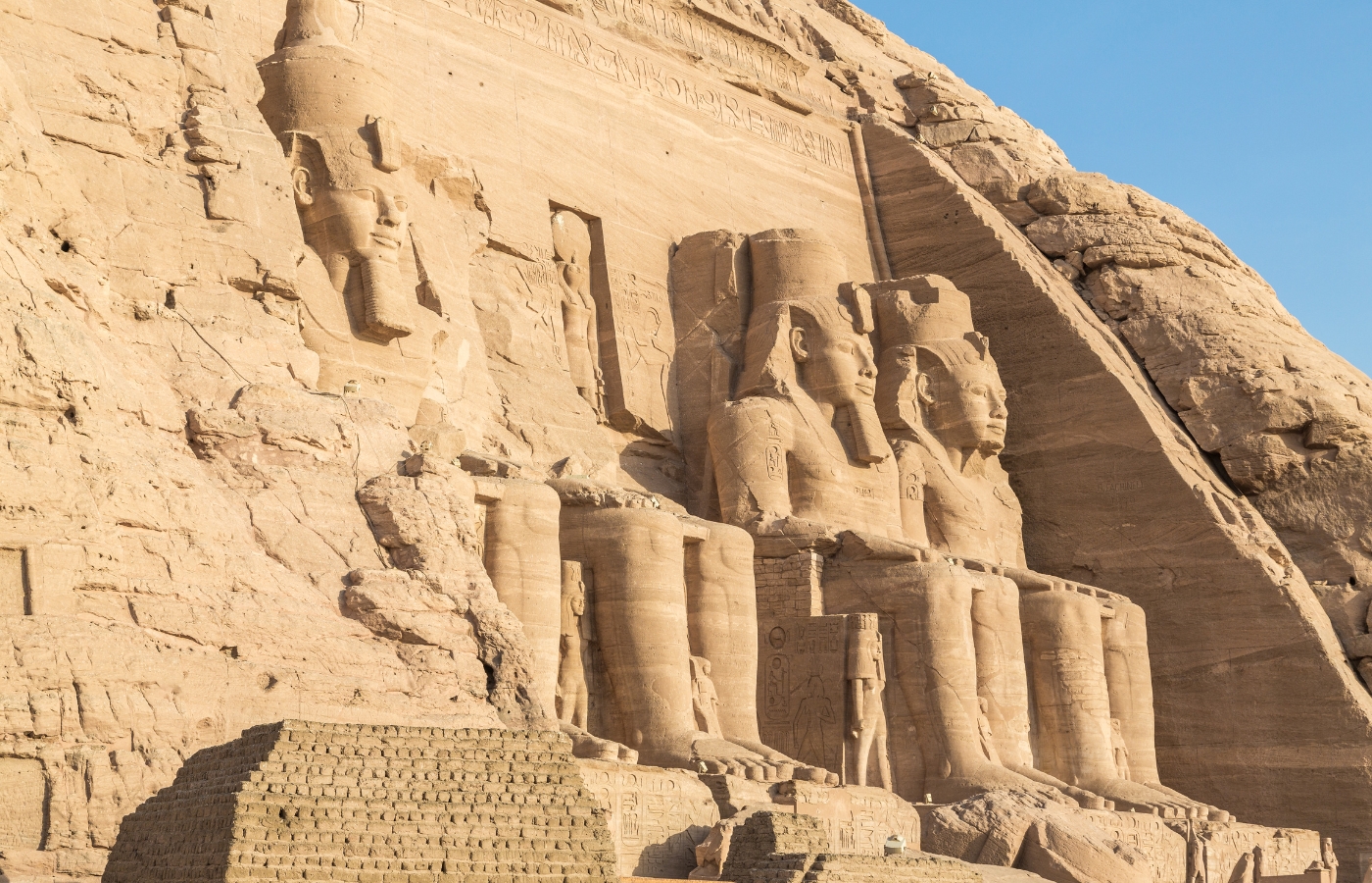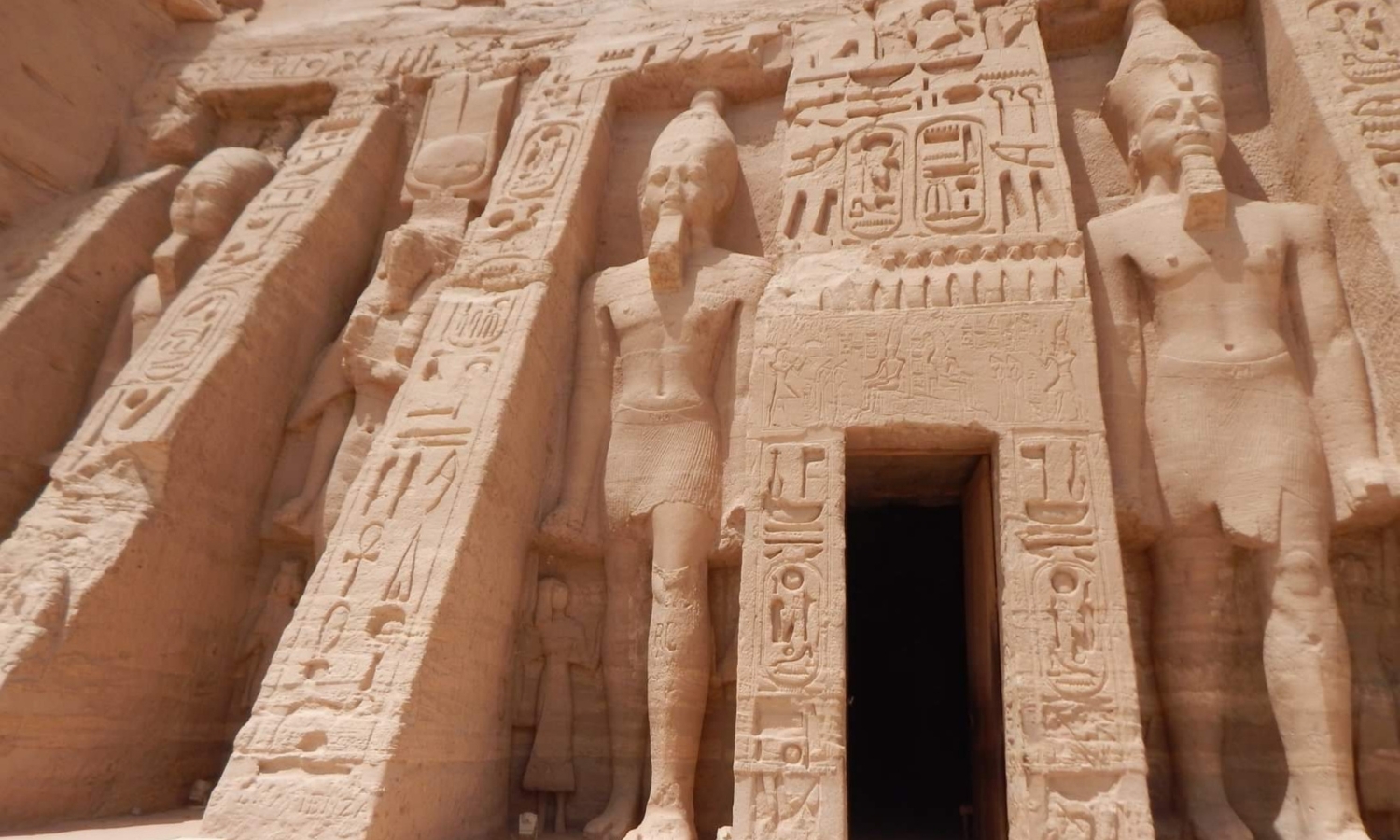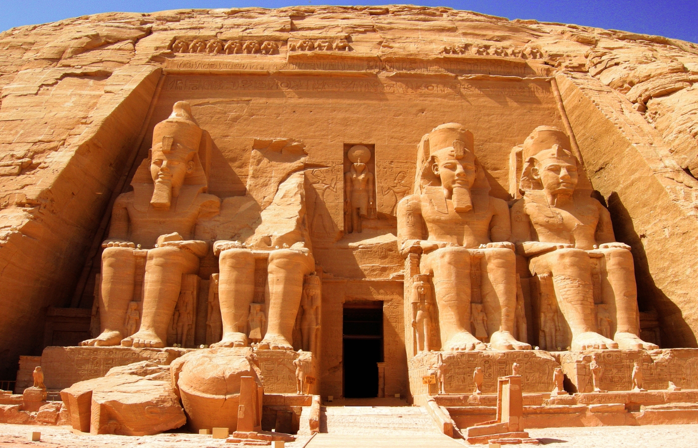 阿布辛貝神廟︰始建於公元前1300年,由古埃及最偉大的法老拉美西斯二世(RamsesⅡ)所建,也是新帝國的法老王時代最受保護的遺跡。神廟依崖鑿建,廟外聳立著四座法老神像,面朝日出的東方。廟內別有洞天,高大廊柱上刻著戰爭場景的藝術浮雕,各處的象形文字描述著拉美西斯二世時代的顯赫戰功。