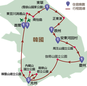 全羅道(潭陽瀟灑園、水杉林蔭道、剛泉山郡立公園、淳昌辣椒醬村、內藏山國立公園-內藏寺、白巖山白羊寺、禪雲山道立公園)、首爾(天空公園、明洞、南大門市場)