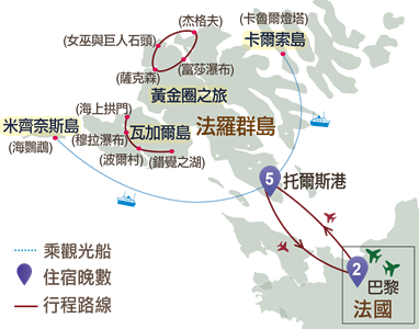 法羅群島:米齊奈斯島、托爾斯港、卡爾索島、特羅拉內斯、瓦加爾島、黃金圈之旅(薩克森、卻娜維克、富莎瀑布、杰格夫)