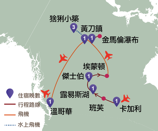 卡加利、班芙、硫磺山、露易斯湖、傑士伯、埃蒙頓、黃刀鎮、猞猁小築、溫哥華