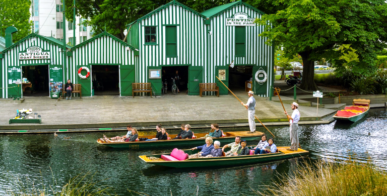 艾芳河平底船之旅︰來自牛津與劍橋的平底船,負責撐船的船伕穿著整齊的英國紳士服裝戴著小圓帽,穿行在流貫基督城市區蜿蜒的艾芳河,散發著優美的閒適的氣息。
