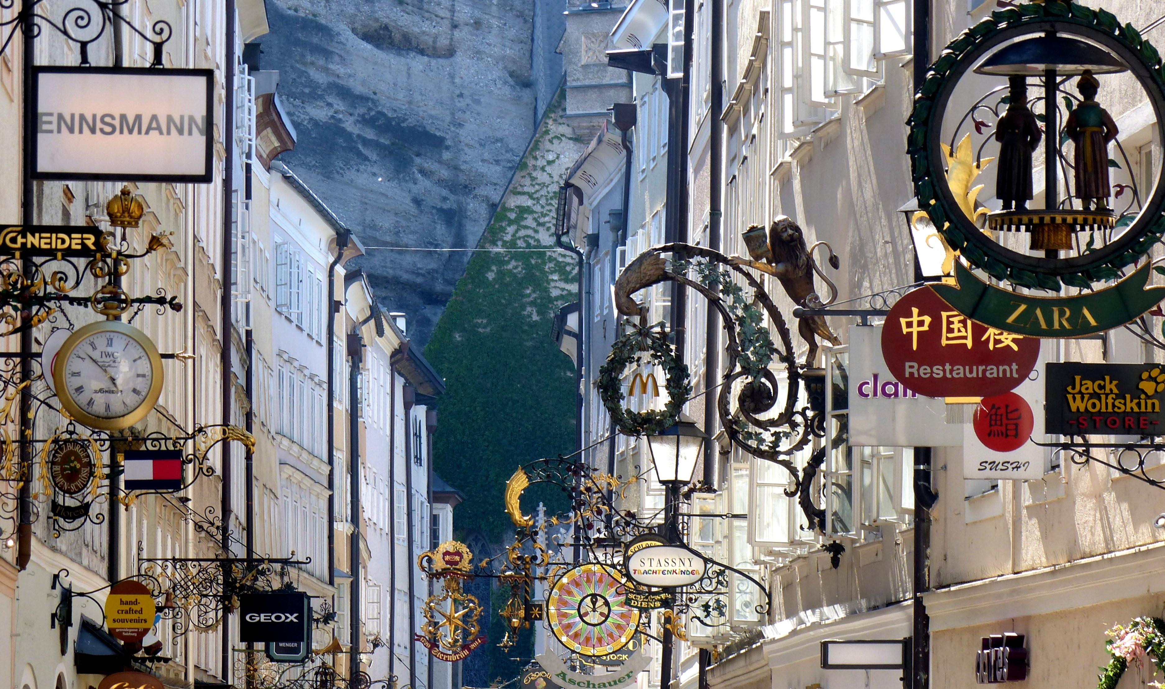 Getreidegasse:一條繁華的街道,每家店鋪都有著奇特美 麗的鑄鐵招牌,別具特色。