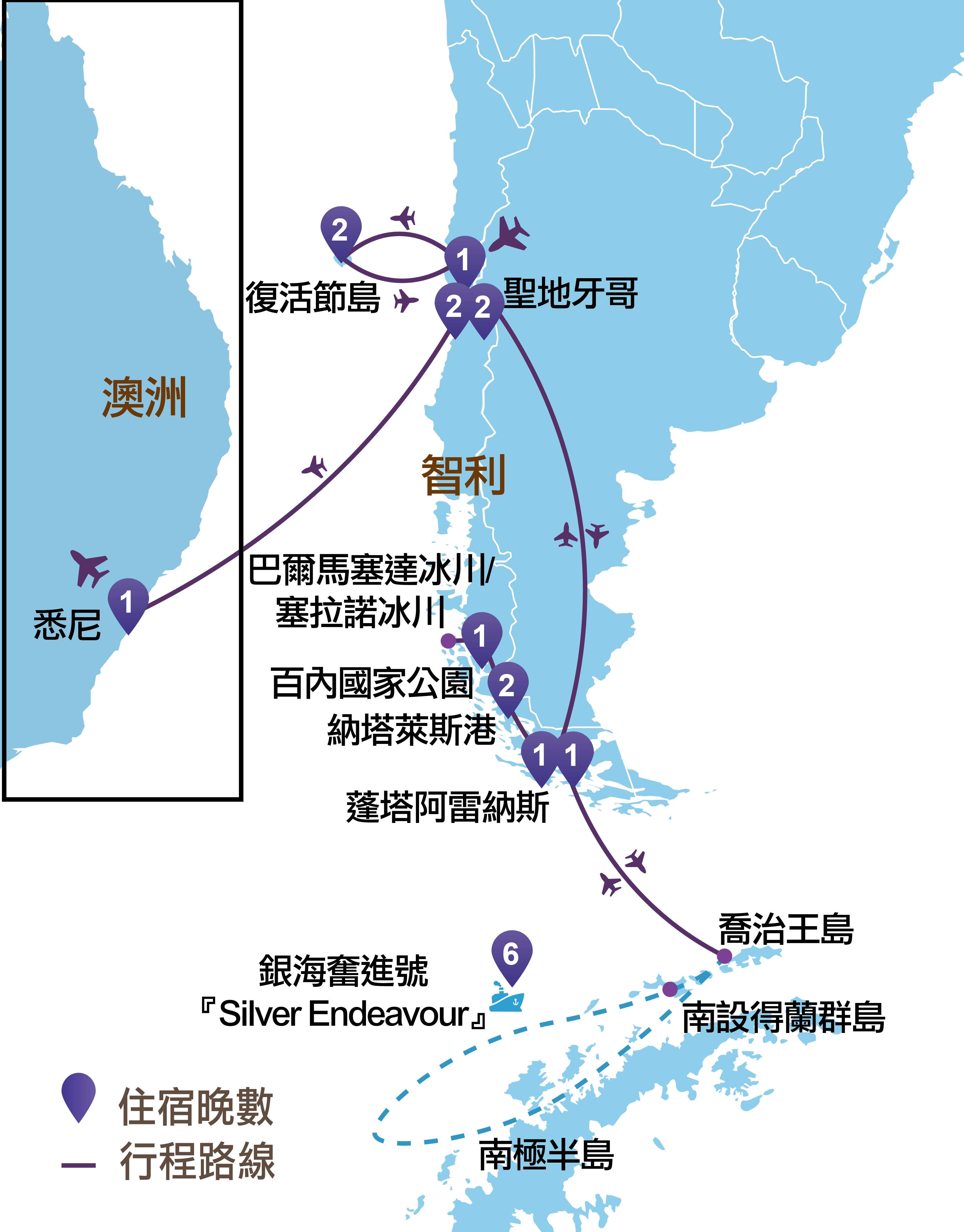 是日銀海奮進號到達喬治王島。離船後,驅車前往機場乘坐銀海遊輪提供的專機前往蓬塔阿雷納斯,抵達後,專車送返酒店休息。