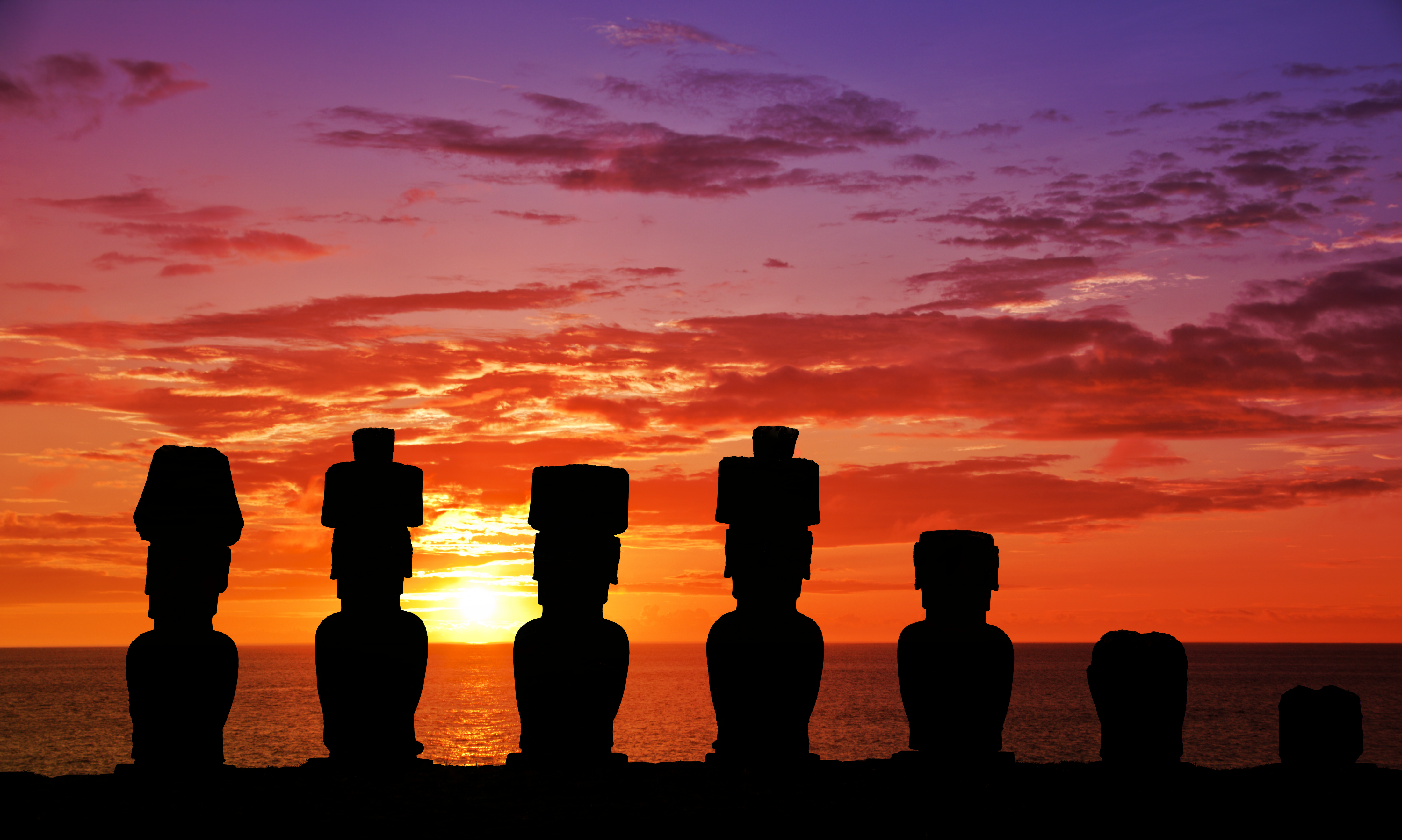 荷蘭人羅根維在 1772 年的復活節那天,發現了這個奇妙的島嶼,因此命名為復活節島。最引人注目的是遍布於島上超過 800 尊巨大無比的巨人石像:摩艾 (Moai) ,摩艾是由整塊石頭雕刻而成,雕工極為細緻,絲毫沒有刻痕。至今仍令人百思不解,在西元前 1680 年,古人是利用何種技術與工具,切割硬度極高的石塊,並刻出這栩栩如生的石像。
