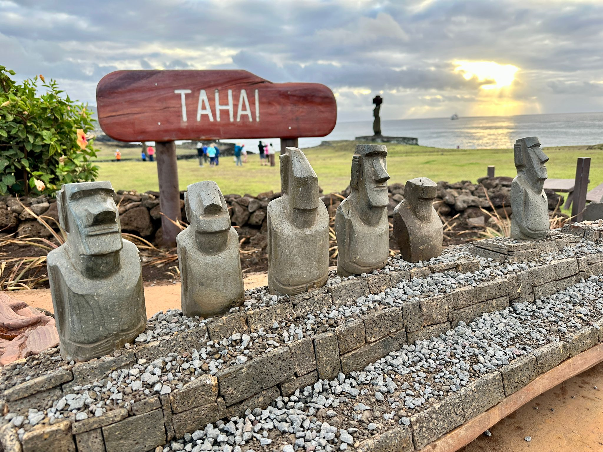 沙灘上有7尊背對海灘的摩艾像,其中4尊頭戴紅帽子,造型獨特可愛。