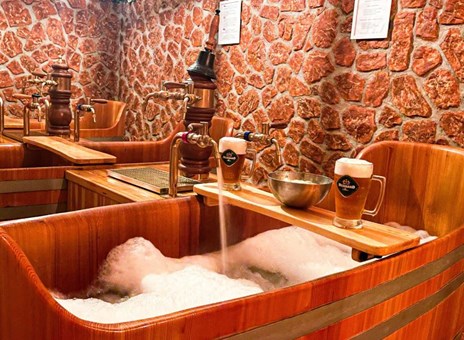 是一種獨特而創新的水療體驗,往往是在古老的啤酒廠或傳統的捷克酒吧中進行,環境充滿歷史感。在溫度約攝氏37度的啤酒浴缸中浸泡,浴缸內是由啤酒花和釀酒酵母等成分調製而成,具有良好的皮膚滋養效果。