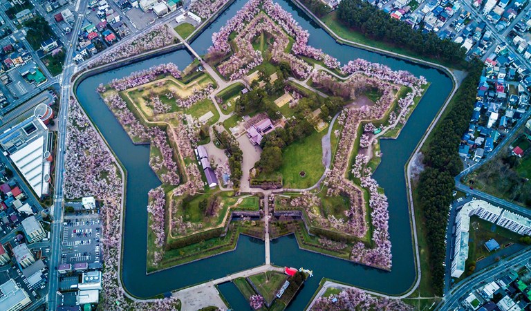 獲國家指定為特別史蹟的五稜郭遺跡。每年春天,櫻花樹在陽光下盛開,形成壯觀的粉紅色海洋。