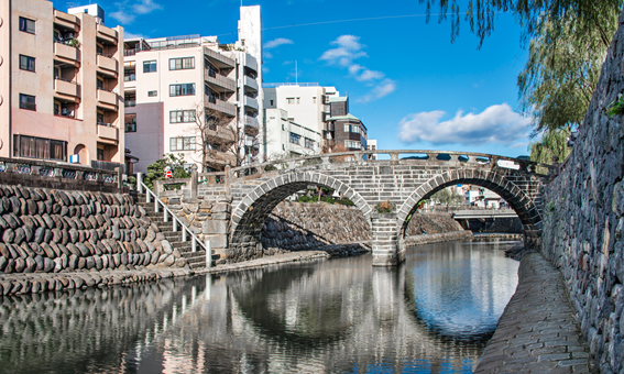是日本最古老的拱形石橋,由於拱形的橋身倒映在水面,實體橋身和倒影一起成了眼鏡的形狀,所以有了「眼鏡橋」的名稱。