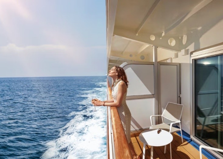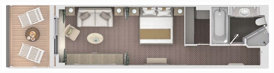 經典露台套房面積約36平方米(388平方呎) ,包括露台(約6平方米,約65平方呎),位於船頭位置,擁私人露台可享有壯麗的日落美景。