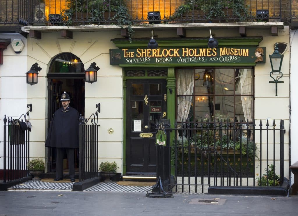店內裝飾有19世紀倫敦街景和偵探故事插畫,販售各式福爾摩斯主題商品。