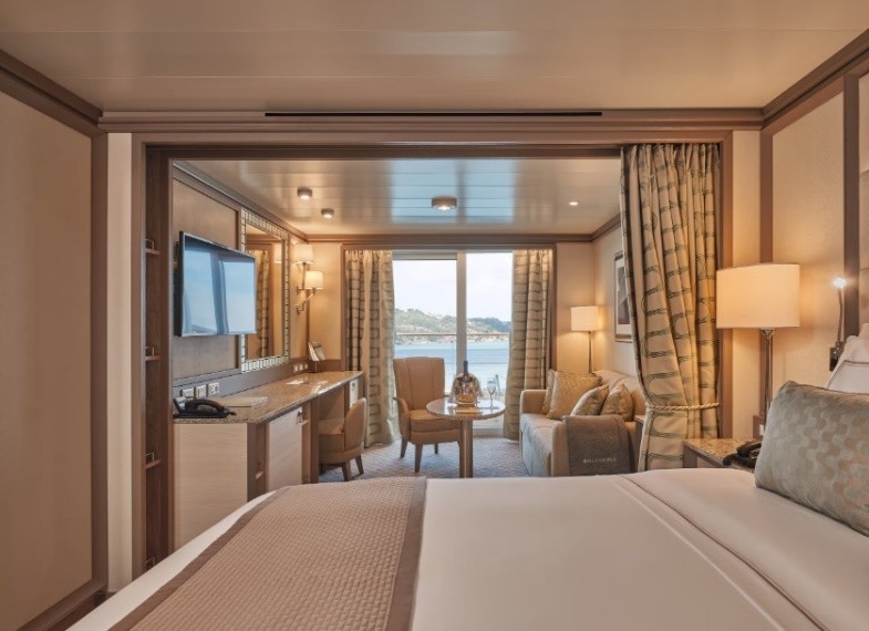 高級露台套房面積約36平方米(388平方呎) ,包括露台(約6平方米,約65平方呎) , 位於上層甲板,私人露台令您享有壯麗的日落美景,配備船上令人期待的所有舒適和豪華設施,寬敞的居住空間及銀海遊輪對細節的關注,是您在海上假期時的溫馨之家。