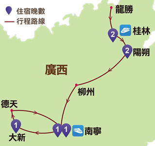 桂林、龍勝、陽朔、柳州、南寧、崇左、大新、德天