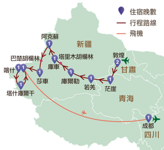 甘肅(敦煌);青海(茫崖);新疆(若羌、尉犁羅布人村寨、庫爾勒、輪台塔里木胡楊林公園、庫車、天山神秘大峽谷、阿克蘇、巴楚紅海灣胡楊林公園、莎車、喀什、喀拉庫勒湖、塔什庫爾幹干);成都