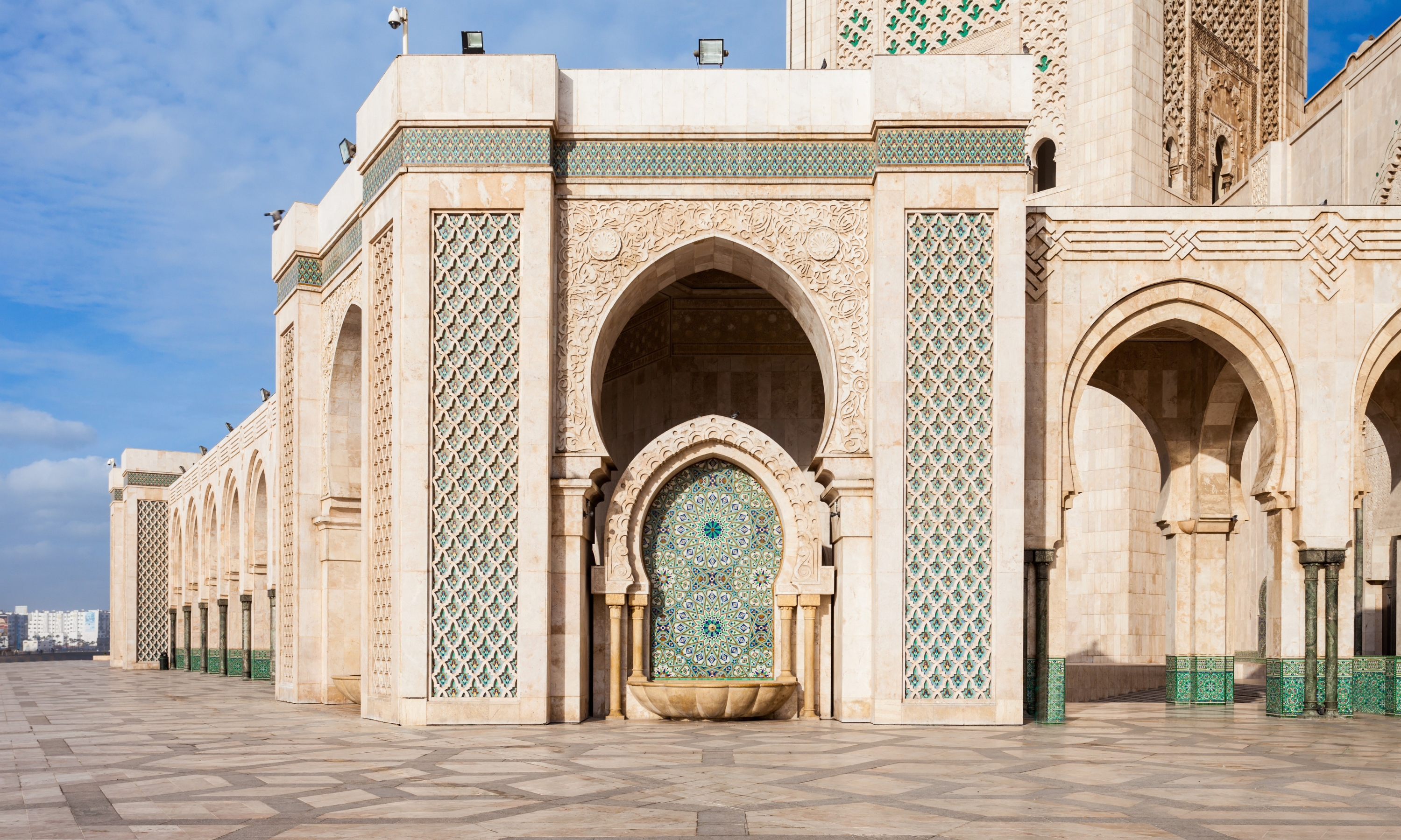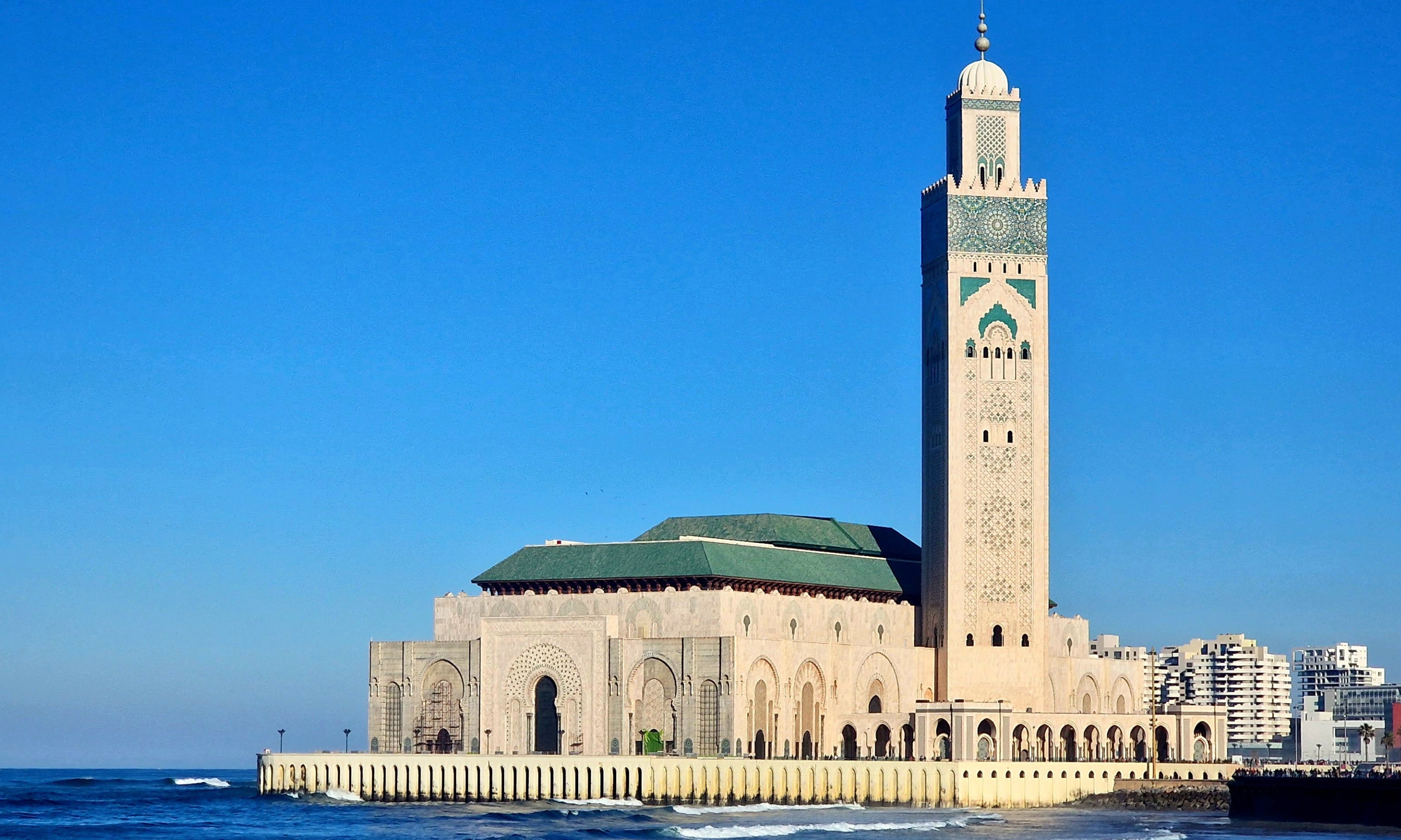 哈辛二世清真寺:非洲地區最大,建於海上的清真寺,可容納25000人。更共動用6000名傳統工匠興建,花上7年時間以及近6億美金建成。