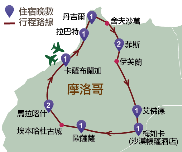 暢遊:卡薩布蘭加、拉巴特、艾⻄拉、丹吉爾、舍夫沙萬、菲斯、艾佛德、梅如卡、撒哈拉沙漠、廷吉爾、歐薩薩、埃本哈杜古城、馬拉喀什