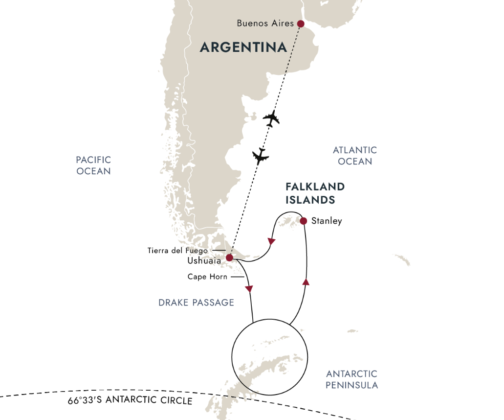 | 12-14 | 福克蘭群島 Falklands Island 福克蘭群島以無邊天際與白色沙灘聞名,繁盛鳥類棲息其間,只有零星農莊點綴其中。此地草丘起伏、野花綻放,與南極的雪白世界形成強烈對比。 您將展開史丹利小鎮導覽,途經朱比利別墅花園、基督教堂大教堂及歷史船塢博物館。若天氣許可,亦會探索信天翁與企鵝棲地,牠們經常與海豹共處,我們會在不干擾牠們的情況下盡量貼近觀察 |