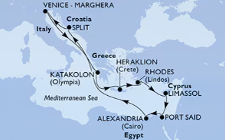 | Day 1 | 馬格拉 (威尼斯), 意大利 登船 Marghera (Venice), Italy |